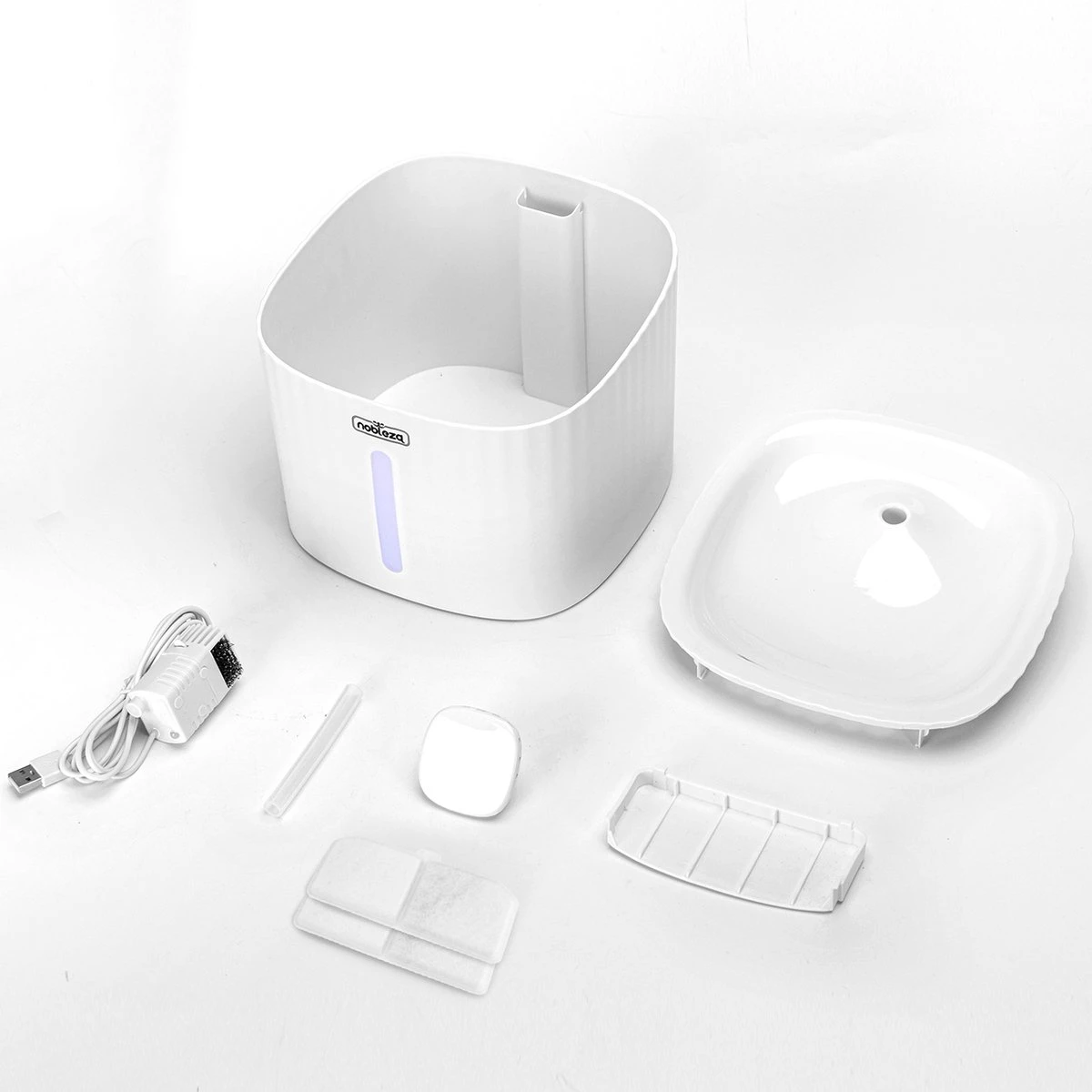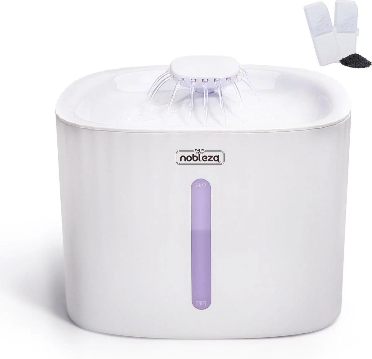 Dit waterfontein leveren wij inclusief 2 koolstoffilters die het water zachter en schoner maken. De sterkte van de waterstraal is regelbaar en terug te brengen naar druppel stand.